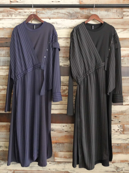 左側はシャツをリメイクしたようなデザインで、右側はウエストからヒップにかけてドロストされたアシンメトリーなデザインワンピースです。