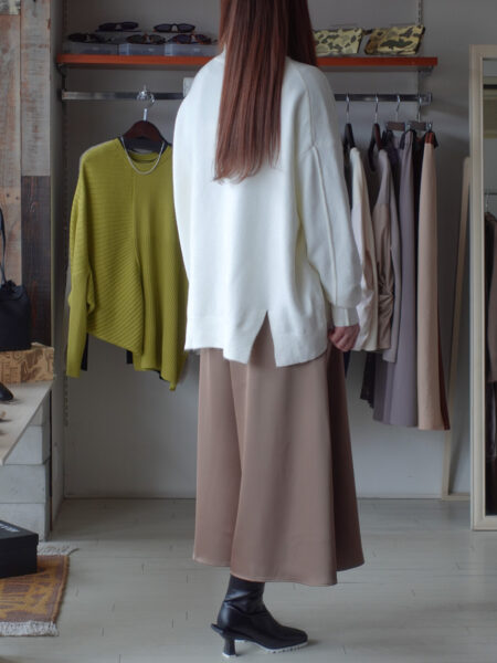 ざっくりニットにふんわりと揺れる裾フレアなシルエットが上品で光沢感のあるサテン生地のキュロットパンツを合わせてキレイめなコーディネートに♪