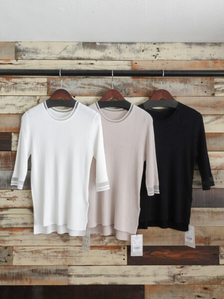 サイズ: 着丈前60cm/後68cm/バスト123cm/裄丈59cmNEW◆『シアーMIX5分袖ニット』