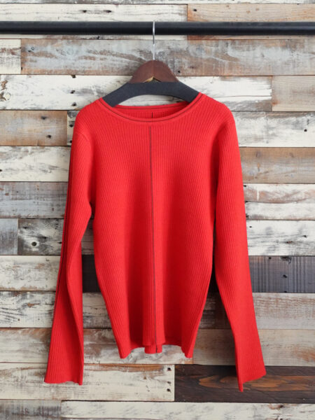 ボディラインを拾わないぐらい伸びるので、体型に合わせて程よくフィットし、上半身をスッキリ見せてくれます◎赤ニット×デニムのコーデはテッパンですよね!!