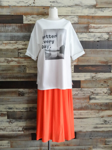 イエロー/オレンジ/チャコール トレンドのフォトプリントTシャツにパッと目を惹くカラースカート合わせ!!