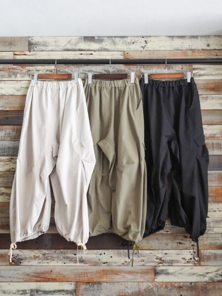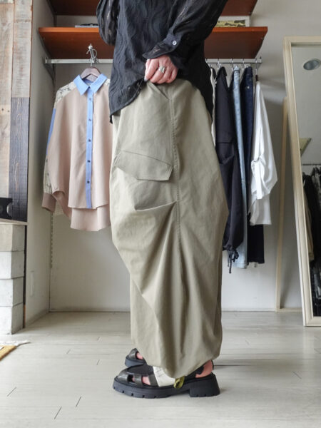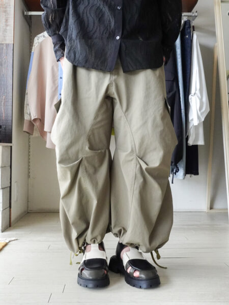 ひざの部分に大胆にタックが施されており、裾は紐でお好きなシルエットに絞れます。