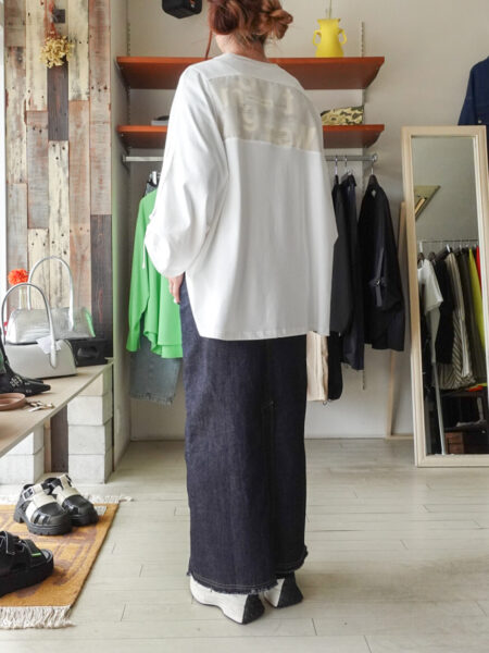 足首まであるロング丈でヒップを包み込み落ち感のあるシルエットが下半身の体型カバーにも◎